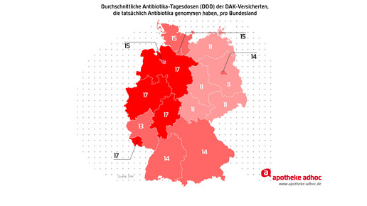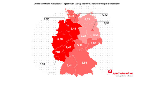 Der Blick auf die Verordnungsdaten zeigt auch ein West-Ost-Gefälle: Während Versicherten 2013 in Rheinland-Pfalz, im Saarland und in Nordrhein-Westfalen durchschnittlich sieben Tagesdosen verordnet wurden, waren es in Mecklenburg-Vorpommern, Brandenburg und Sachsen weniger als fünf.