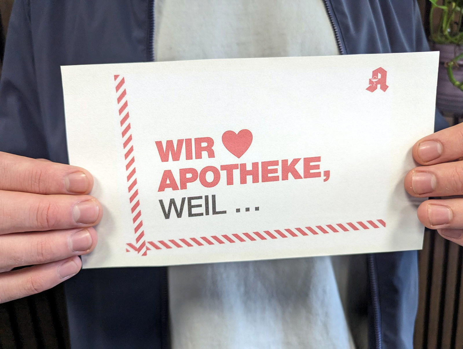 Auf den Postkarten mit der Aufschrift „Wir lieben Apotheke, weil ...“ sollen die Patientinnen und Patienten laut Abda „mit einer persönlichen, handschriftlich eingetragenen Aussage zum Ausdruck bringen, warum sie ihre Apotheke schätzen“. Auch Name und Ort können eingetragen werden.