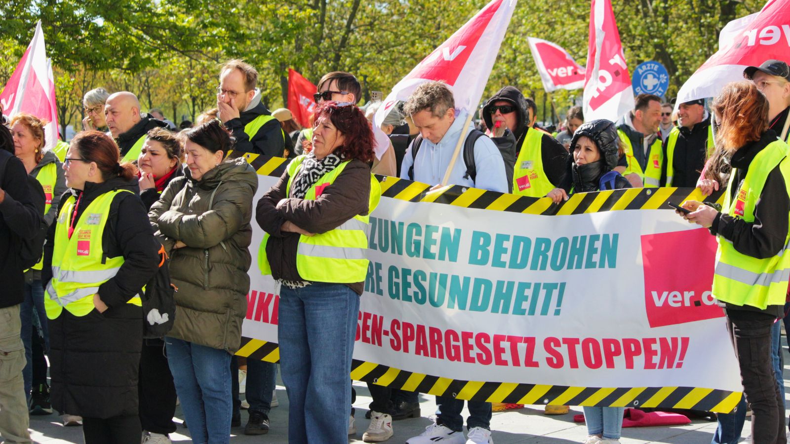 Die Gewerkschaft Verdi hat wegen des Spargesetzes von Gesundheitsministerin Nina Warken (CDU) eine Protestkundgebung vor dem Kanzleramt organisiert, auch Die Linke hatte zur Teilnahme aufgerufen. Kritisiert wird die Belastung der Versicherten, während die Pharmaindustrie glimpflich davonkomme.