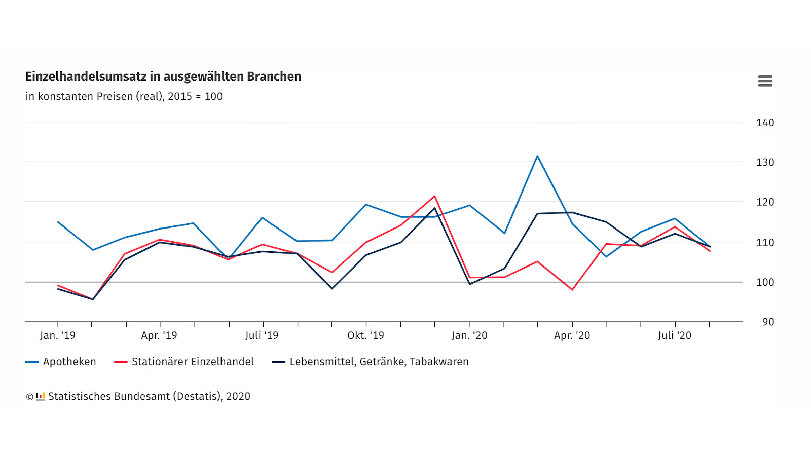 Der Einzelhandel insgesamt hat im August nach vorläufigen Ergebnissen preis-, kalender- und saisonbereinigt 3,1 Prozent mehr umgesetzt als im Juli. Im Vergleich zum Vorjahresmonat stieg der Umsatz real um 3,7 Prozent. Im Vergleich zum Februar, dem Monat vor Ausbruch der Corona-Pandemie in Deutschland, war der Umsatz im August real um 5,8 Prozent höher.