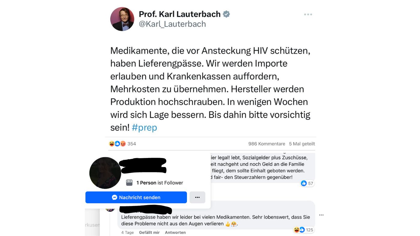 So wurde etwa ein Kommentar eines Hausarztes auf einen Post von Lauterbach von einem Profil, das ansonsten keine öffentlichen Aktivitäten aufweist, wie folgt kommentiert: