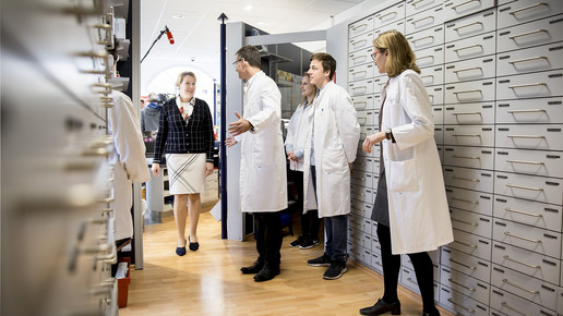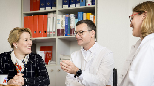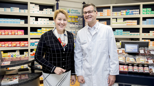 Über persönliche Kontakte sei der Termin zustandegekommen, erzählt Stolle. Und so stand die Ministerin am Vormittag mit Fotograf und zwei Kamerateams im Gepäck vor der Offizin. Neben Interviews und Fototermin war für Stolle vor allem die Führung von Bedeutung. „Ich habe ihr den Backoffice-Bereich gezeigt, wie die Rezeptur funktioniert und mit ihr über Themen gesprochen, die ihr wichtig sind“, erzählt der Apotheker.
