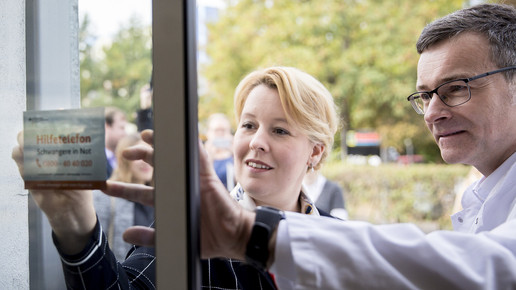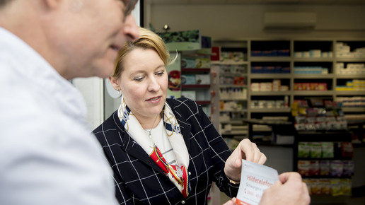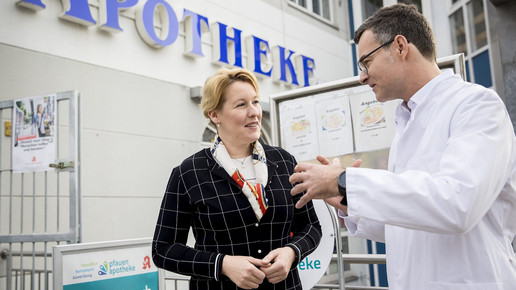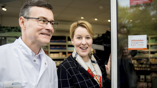Schwanger und keiner darf es erfahren? Frauen in dieser schwierigen Situation will die Bundesregierung seit vier Jahren mit einem eigenen Hilfsprogramm unter die Arme greifen. Um dafür Publicity zu schaffen, war Familienministerin Franziska Giffey (SPD) heute in der Berliner Pfauen-Apotheke und hat sich von Inhaber Joachim Stolle beraten lassen.
