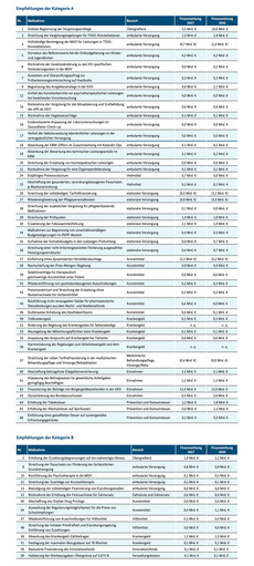 Insgesamt gibt es 66 Empfehlungen. Von den Maßnahmen sollen vor allem die Leistungserbringer betroffen sein, alleine die „globale Begrenzung der Vergütungsanstiege“ auf die Grundlohnrate minus 1 Prozent soll 5,5 Milliarden Euro im kommenden Jahr bringen. Es gehe nicht darum, die Vergütung zusammenzustreichen, sondern eben nur den Anstieg zu begrenzen. Mengenwachstum aufgrund des demografischen Wandels würden so nicht verhindert.