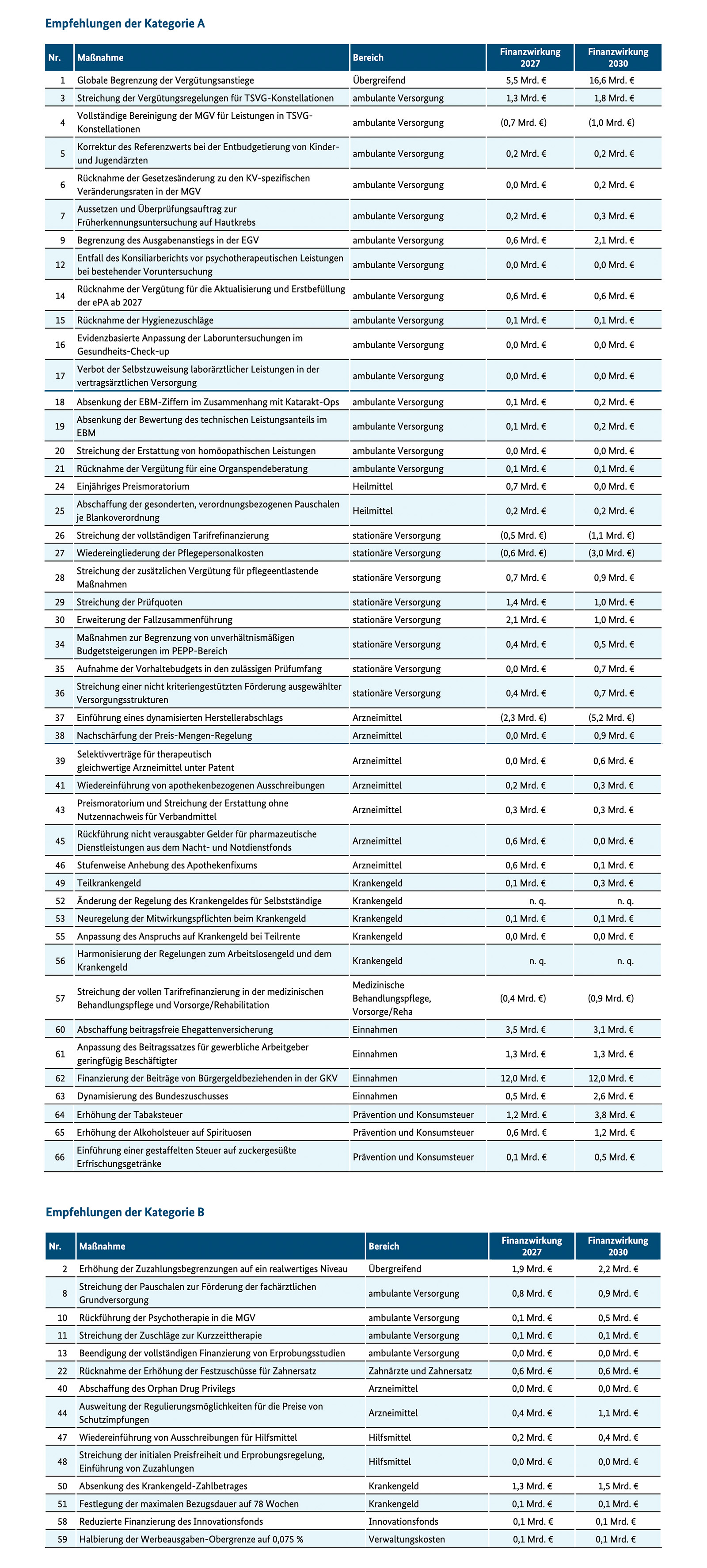 Die Finanzierung der GKV-Beiträge für Bürgergeldempfänger soll 12 Milliarden Euro bringen, die Abschaffung der kostenfreien Mitversicherung von Ehepartnern 3,5 Milliarden Euro. Alkohol, Tabak und Softdrinks sollen besteuert werden und in Summe 1,9 Milliarden Euro an Einnahmen bringen.