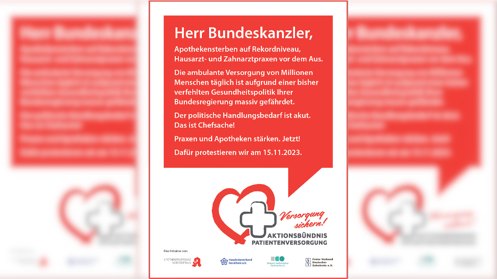 In Nordrhein-Westfalen macht das „Aktionsbündnis Patientenversorgung“ weiter Druck. Eine Woche vor dem Protesttag in Dortmund und Düsseldorf hat die Initiative aus Apothekern, Ärzten und Zahnärzten heute in der Bild-Zeitung eine ganze Zeitungseite belegt. In der Anzeige wird Bundeskanzler Olaf Scholz aufgefordert, Gesundheitsminister Karl Lauterbach (beide SPD) in die Schranken zu verweisen.