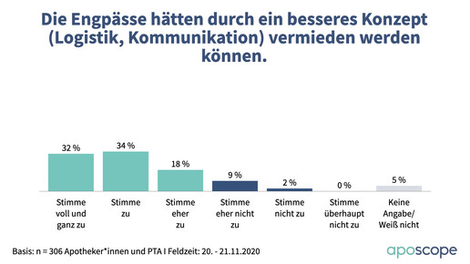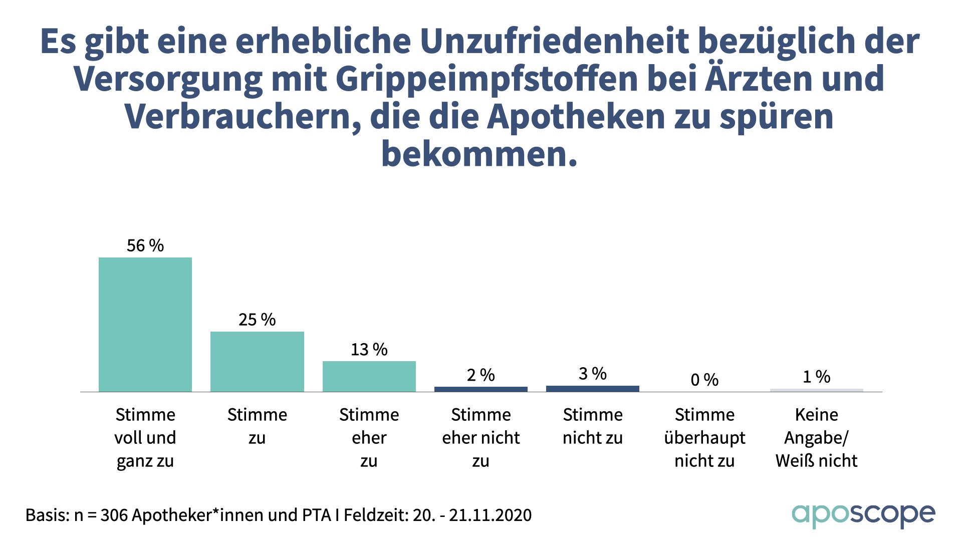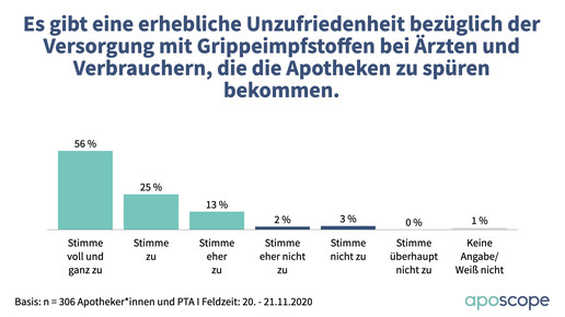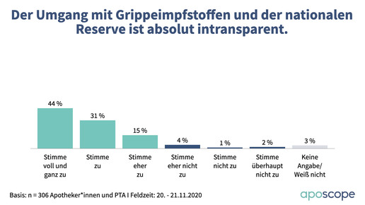 Durch ein besseres Konzept in Sachen Logistik und Kommunikation hätten die Engpässe vermieden werden können, sind 84 Prozent überzeugt. Insbesondere der Umgang mit der nationalen Reserve ist nach Ansicht von neun von zehn Befragten absolut intransparent. Ausbaden müssen den Ärger am Ende auch die Apothekenteams: 94 Prozent stimmen der Aussage zu, dass es bezüglich der Versorgung mit Grippeimpfstoffen eine erhebliche Unzufriedenheit bei Ärzten und Verbrauchern gibt, die die Apotheken zu spüren bekommen.