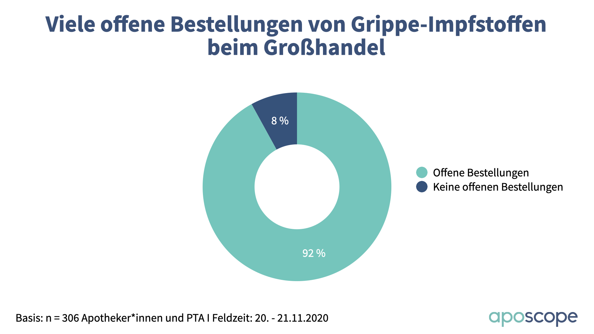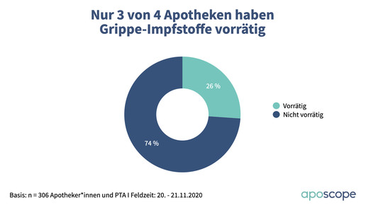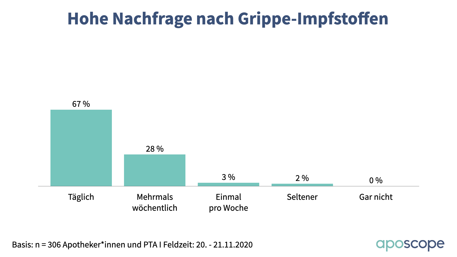 Nach wie vor sind Grippeimpfstoffe ein beherrschendes Thema in den Apotheken. Täglich (67 Prozent) oder jedenfalls mehrmals pro Woche (28 Prozent) gibt es laut einer aktuellen aposcope-Umfrage entsprechende Nachfragen. Drei von vier Apotheken haben keinen Grippeimpfstoff vorrätig (74 Prozent), aber mehr als neun von zehn Apotheken haben Bestellungen beim Großhandel offen (92 Prozent).