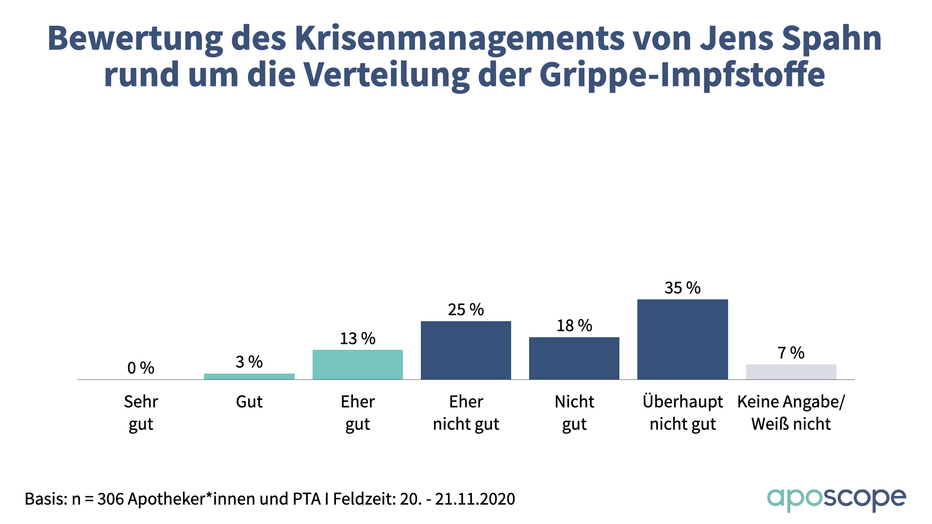 Das Krisenmanagement von Gesundheitsminister Jens Spahn rund um die Verteilung von Grippeimpfstoffen halten 78 Prozent für unzureichend, im Detail: „eher nicht gut“ (25 Prozent), „nicht gut“ (18 Prozent), „überhaupt nicht gut“ (35 Prozent). Nur knapp 16 Prozent finden, dass er seinen Job in diesem Zusammenhang gut macht.