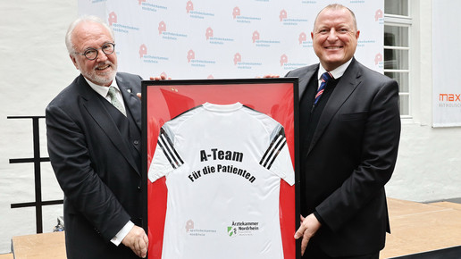 Um die Bedeutung der interdisziplinären Zusammenarbeit zwischen Arzt und Apotheker auch bildlich zu verdeutlichen, übergab Hoffmann dem Präsidenten seiner Schwesterkammer anschließend ein Trikot mit der Aufschrift „A-Team – Für die Patienten“. Schließlich sei die interdisziplinäre Weiterentwicklung des Gesundheitssystems ihm und der Vizepräsidentin Kathrin Hollingshaus ein wesentliches Anliegen. Aber nicht nur das: „Wir haben im Jahr 2020 noch sehr viel vor“, sagte Hoffmann. Unter anderem möchte die neue Führungsspitze an einer zukunftsorientierten Weiterentwicklung der inhabergeführten Apothekenwelt, der Erneuerung des Berufsbildes für Apotheker sowie an der Nachwuchsgewinnung arbeiten.