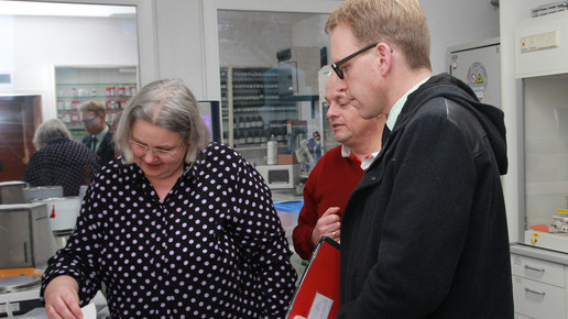 Durch ein ausgeprägtes Logistiknetz, das die Apotheke dreimal täglich beliefere, sei nahezu jedes Arzneimittel innerhalb weniger Stunden vor Ort – oder per Botendienst beim Patienten zu Hause, so Barrmeyer. Aber auch individuelle Rezepturen würden in jeder Apotheke vor Ort angefertigt. „Für Kinder, aber auch für andere Patienten fertigen wir häufig selbst passende Rezepturen an. Erst kürzlich haben wir farblich unterschiedliche Kapseln für ein Kleinkind hergestellt. So wusste die Mutter, welche Kapsel zu welcher Tageszeit eingenommen werden muss.“ Wie eine Kapselherstellung im Labor funktioniert und wie aufwendig die Protokollierung dazu ist, zeigte Apothekerin Sabine Barrmeyer dem Bundestagsabgeordneten.