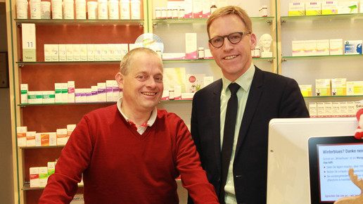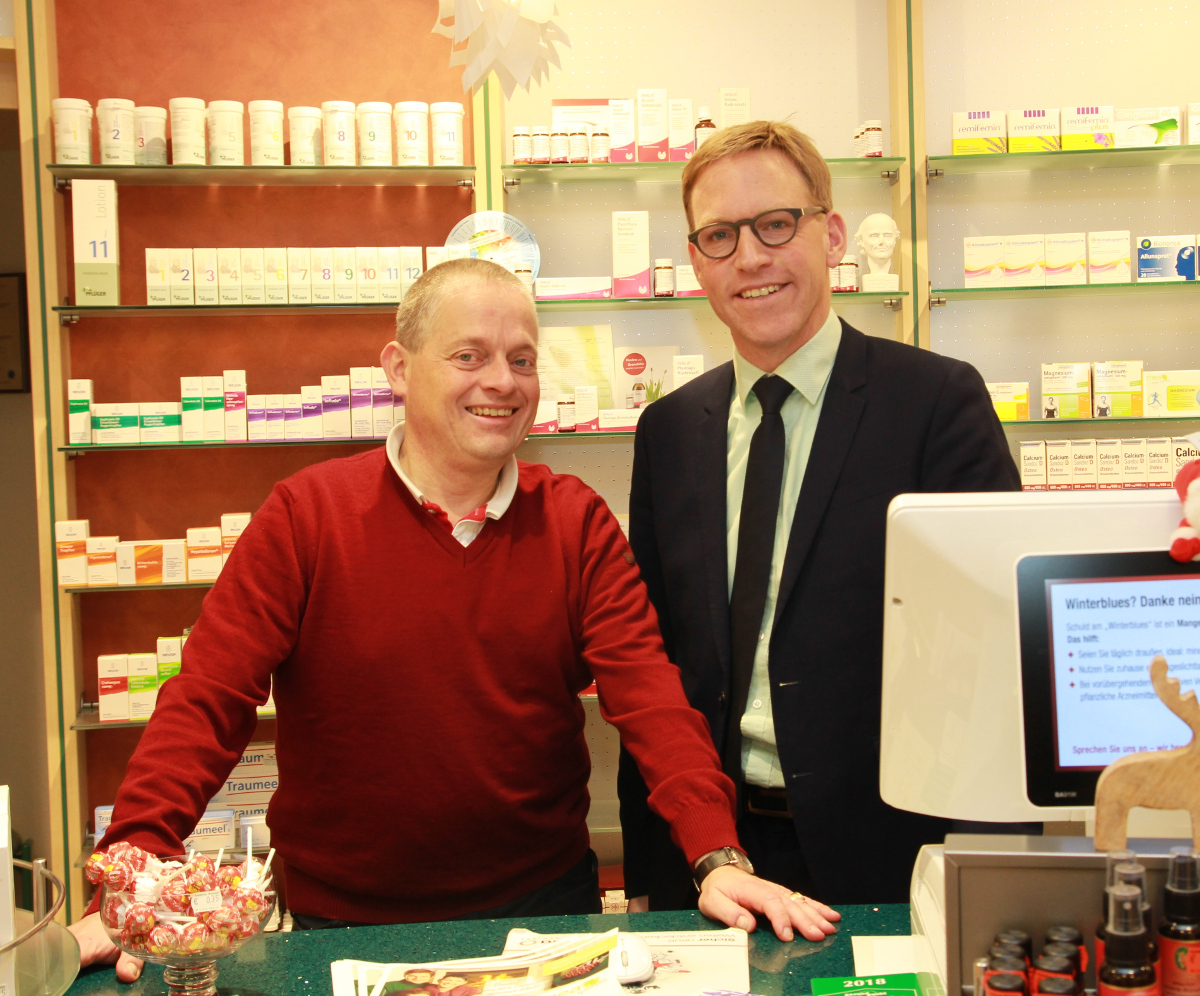 Besuch aus der Politik in der Laurentius-Apotheke in Coesfeld: Der jüngst in den Bundestag gewählte Abgeordnete Marc Henrichmann war zu Gast bei Dr. Stephan Barrmeyer, um einen Blick hinter die Kulissen einer öffentlichen Apotheke zu werfen. Der 41-jährige CDU-Politiker unterstrich die hohe Bedeutung der örtlichen Apotheken für die Versorgungssicherheit im ländlichen Raum: „Dieses System gilt es zu schützen.“
