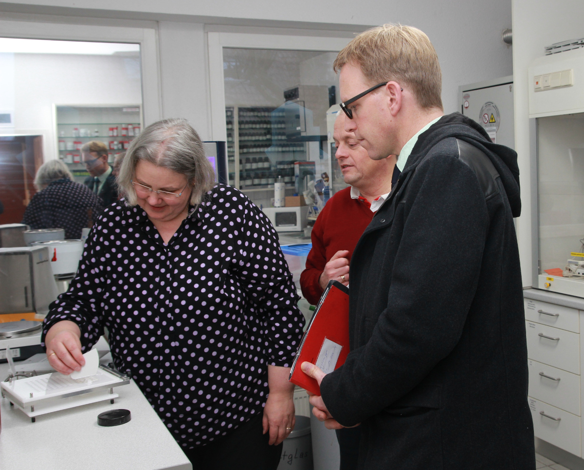 Durch ein ausgeprägtes Logistiknetz, das die Apotheke dreimal täglich beliefere, sei nahezu jedes Arzneimittel innerhalb weniger Stunden vor Ort – oder per Botendienst beim Patienten zu Hause, so Barrmeyer. Aber auch individuelle Rezepturen würden in jeder Apotheke vor Ort angefertigt. „Für Kinder, aber auch für andere Patienten fertigen wir häufig selbst passende Rezepturen an. Erst kürzlich haben wir farblich unterschiedliche Kapseln für ein Kleinkind hergestellt. So wusste die Mutter, welche Kapsel zu welcher Tageszeit eingenommen werden muss.“ Wie eine Kapselherstellung im Labor funktioniert und wie aufwendig die Protokollierung dazu ist, zeigte Apothekerin Sabine Barrmeyer dem Bundestagsabgeordneten.