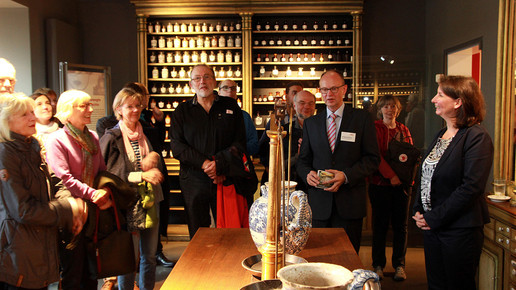 „Wir haben diese Apotheke, deren Wurzeln bis in das Jahr 1643 zurückreichen, in ein Ausstellungskonzept eingebettet“, erläutert Hauptgeschäftsführer Dr. Andreas Walter und stellte erfreut fest, wie gut diese Idee angenommen wird. So waren alle acht Führungen, die am Sonntag angeboten wurden, mit jeweils 40 bis 50 Teilnehmern restlos ausgebucht. Parallel dazu gab es auf der Bühne hinter dem Kammergebäude neben Live-Musik auch viele Informationen rund um die Arbeit der Apothekerkammer und die Besonderheiten des Umbaus. Wie wichtig die wohnortnahe Versorgung der Menschen durch die Apotheke ist, verdeutlichten nicht nur Bürgermeisterin Karin Reismann und Kammerpräsidentin Gabriele Regina Overwiening.