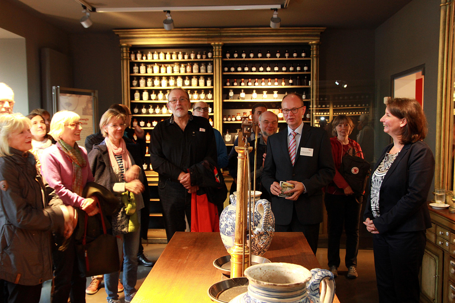 „Wir haben diese Apotheke, deren Wurzeln bis in das Jahr 1643 zurückreichen, in ein Ausstellungskonzept eingebettet“, erläutert Hauptgeschäftsführer Dr. Andreas Walter und stellte erfreut fest, wie gut diese Idee angenommen wird. So waren alle acht Führungen, die am Sonntag angeboten wurden, mit jeweils 40 bis 50 Teilnehmern restlos ausgebucht. Parallel dazu gab es auf der Bühne hinter dem Kammergebäude neben Live-Musik auch viele Informationen rund um die Arbeit der Apothekerkammer und die Besonderheiten des Umbaus. Wie wichtig die wohnortnahe Versorgung der Menschen durch die Apotheke ist, verdeutlichten nicht nur Bürgermeisterin Karin Reismann und Kammerpräsidentin Gabriele Regina Overwiening.