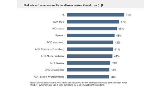 Demnach bescheinigt jeder zweite Befragte der TK absolute Zufriedenheit mit dem letzten Kontakt. Bei der DAK Gesundheit und AOK Baden-Württemberg war es nur rund jeder Dritte. Wenig Vertrauen haben die Versicherten offenbar zu Barmer, AOK Baden-Württemberg und AOK Bayern.