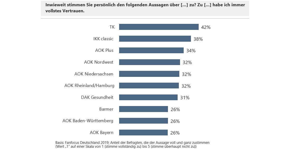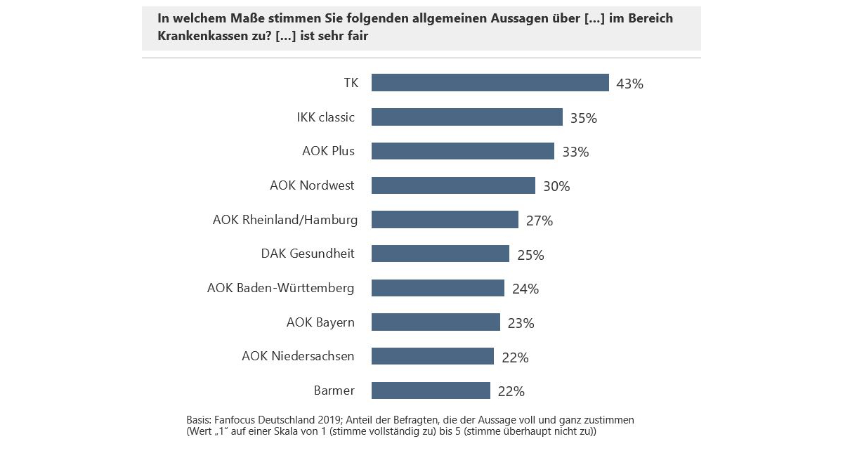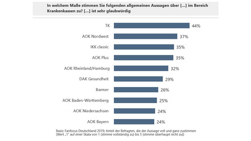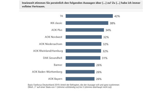 Es ging um Leistungen, Service und emotionale Bindung. Die Techniker Krankenkasse landet mit 41 Prozent Fans auf Platz 1. Es folgt die AOK Plus mit Versicherten in Sachsen und Thüringen (31 Prozent) vor AOK Nordwest und IKK classic (je 28 Prozent). Die schlechteste Note hat die AOK Bayern bekommen.