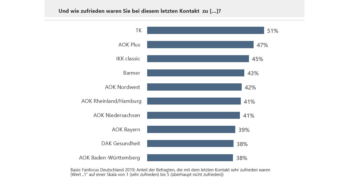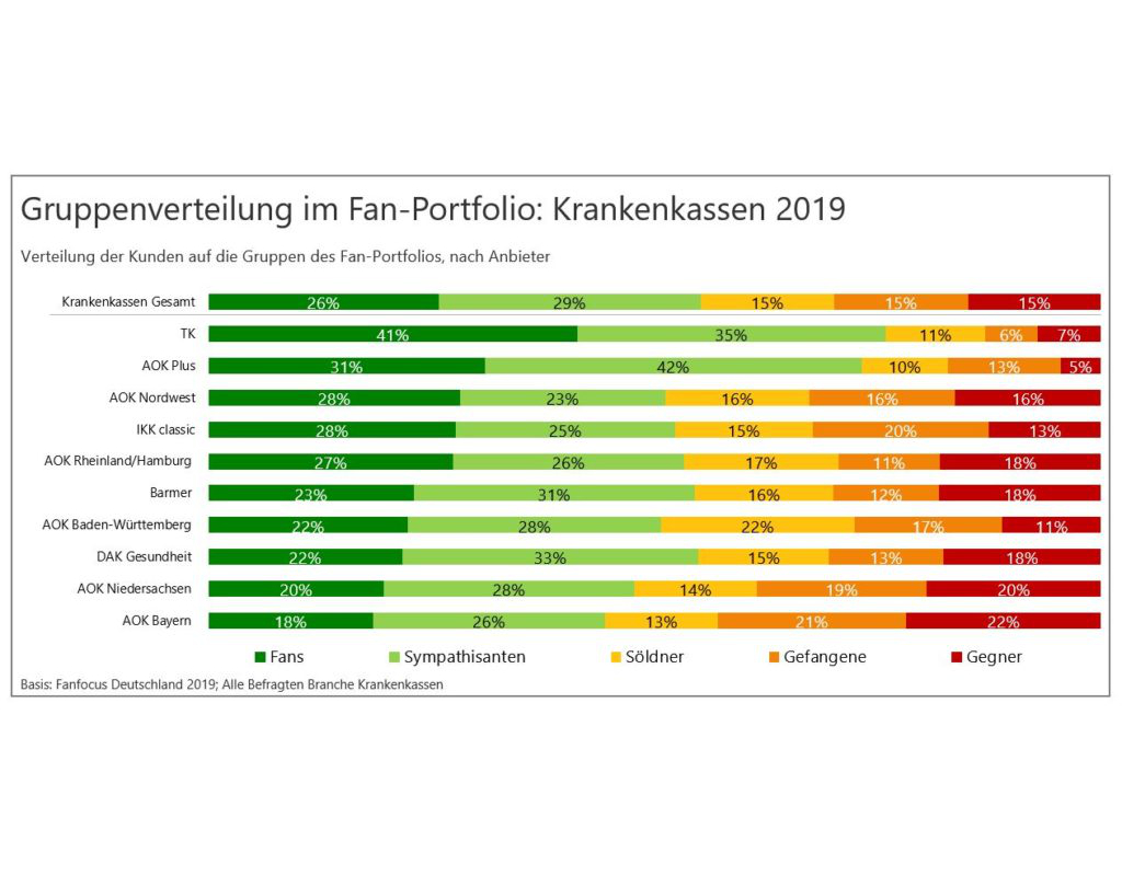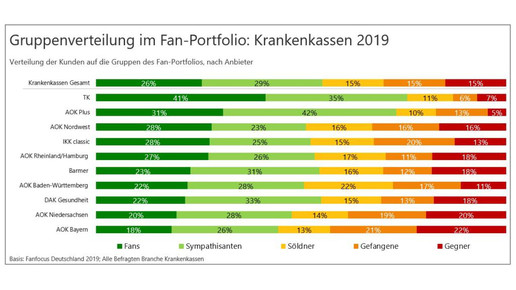 2hm hat 2000 GKV-Versicherte Krankenkassen nach ihrer Zufriedenheit befragt. Beim „Fanfocus Deutschland“ werden in fünf Kategorien eingeteilt: Fans, Sympathisanten, Söldner, Gefangene und Gegner. Letztere können für Unternehmen gefährlich werden, weil sie ihre Unzufriedenheit häufig öffentlich kundtun, ob im privaten Umfeld oder öffentlich in sozialen Netzwerken.