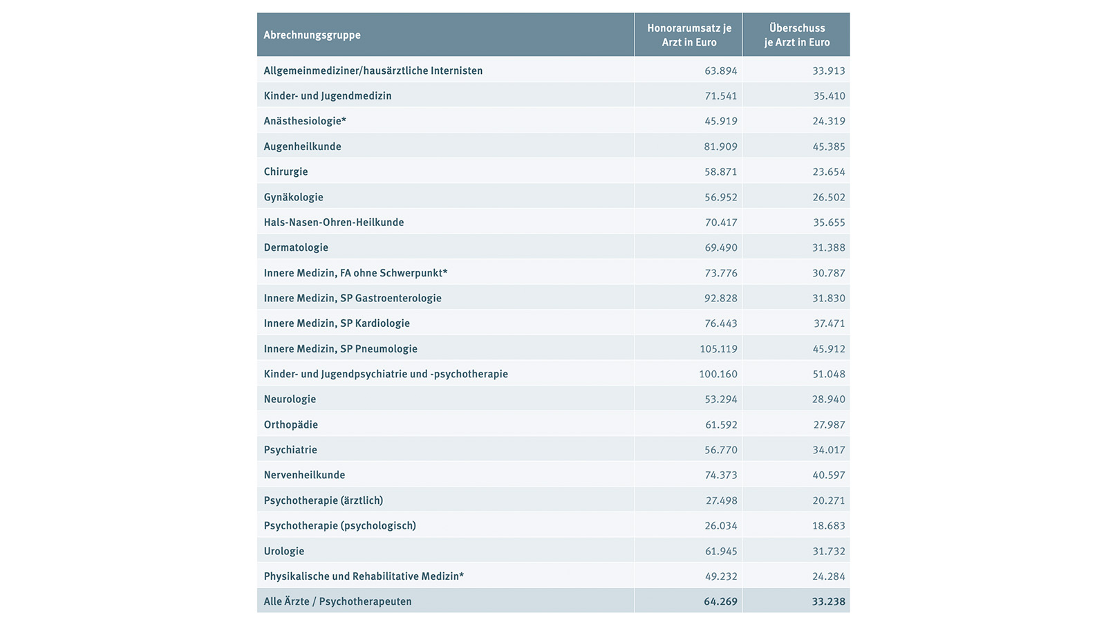 Beim Honorarumsatz je Arzt führen Humangenetik (310.000 Euro), Nephrologie (238.000 Euro), Strahlentherapie (188.000 Euro), Radiologie (116.000 Euro), Pathologie (110.000 Euro), Nuklearmedizin (106.000 Euro), Endokrinologie (106.000 Euro), Pneumologie (105.000 Euro), Kinder- und Jugendpsychiatrie (100.000 Euro), Onkologie (100.000 Euro), Gastroenterologie (92.000 Euro),