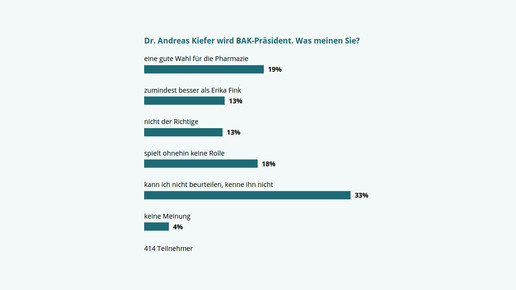 18 Prozent der Teilnehmer fanden, dass die Person des BAK-Präsidenten ohnehin keine Rolle spielt. Etwas mehr (19 Prozent) finden immerhin, dass Kiefer eine gute Wahl für die Pharmazie ist; weitere 13 Prozent finden den Kammerpräsidenten aus Rheinland-Pfalz zumindest besser als seine Vorgängerin Erika Fink.
