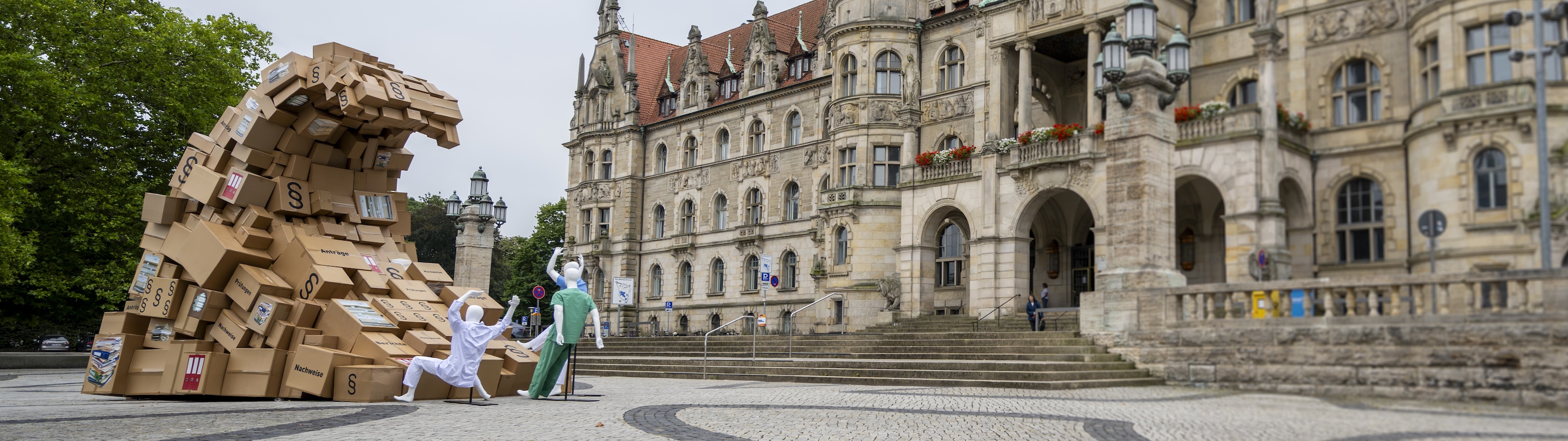 Die Patientenversorgung an den Kliniken gerät nach Angaben der Niedersächsischen Krankenhausgesellschaft (NKG) durch immer mehr Vorschriften und Dokumentationspflichten unter Druck. Mit einer fünf Meter hohen Welle aus Kartons und Aktenordnern machte die NKG den Berg an Bürokratie jetzt vor dem Rathaus in Hannover sichtbar.