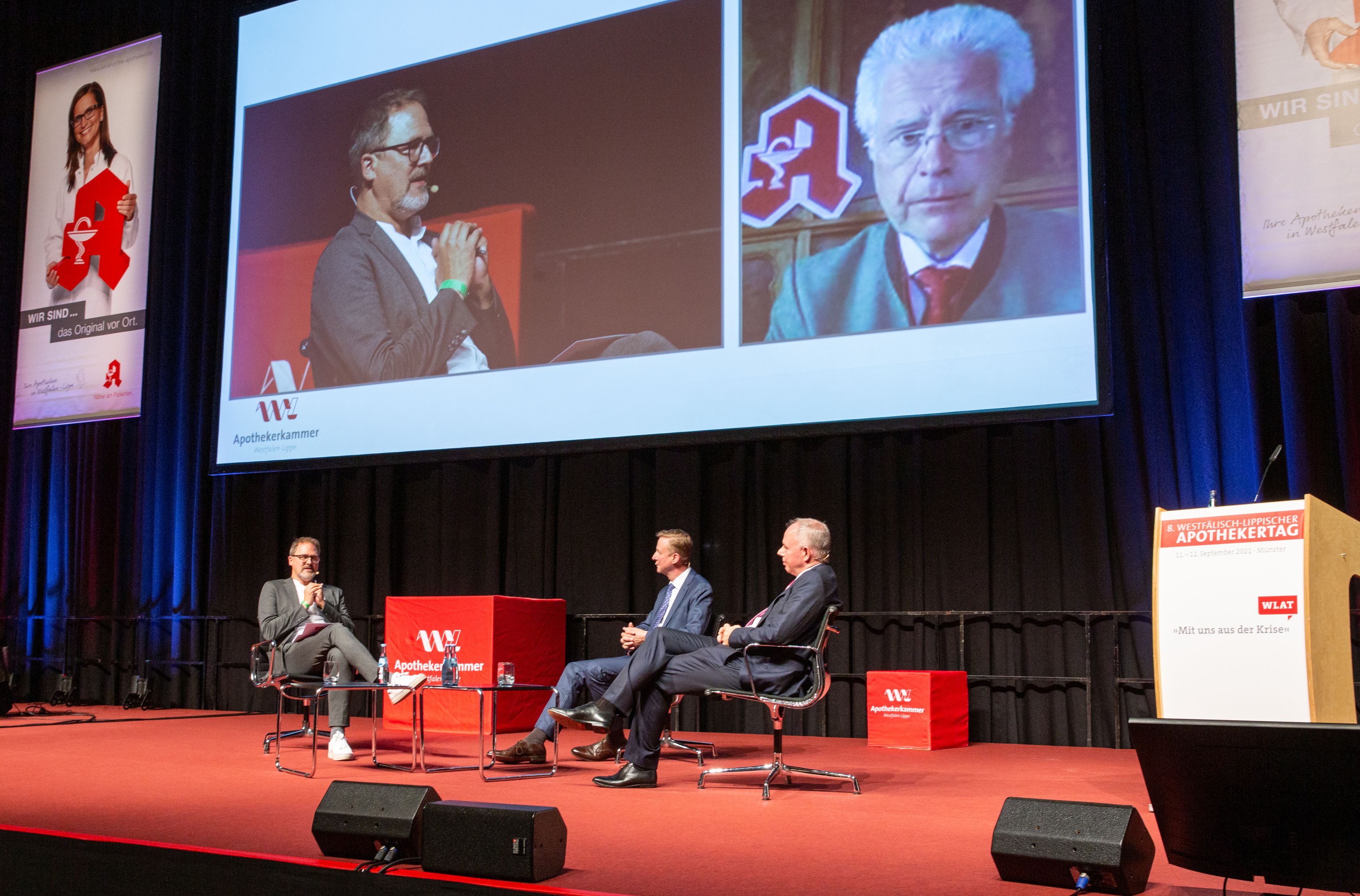 Im Rahmen des Westfälisch-lippischen Apothekertages (WLAT) diskutierten BAK-Präsident Thomas Benkert, AKWL-Vizepräsident Frank Dieckerhoff und der Noweda-Vorstandsvorsitzende Dr. Michael Kuck über die Leistungen der Apotheke vor Ort in der Corona-Pandemie. Außerdem ging es um die verstärkte Digitalisierung durch Einführung des E-Rezeptes und die Bundestagswahl am 26. September.