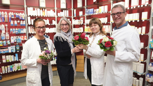 „Herzlichen Dank für Ihren Einsatz beim Bewältigen der Lieferengpässe! Es ist Wahnsinn, was Sie geleistet haben und weiterhin leisten. Ich möchte mich bei allen Apothekenteams in Deutschland für ihren engagierten, kompetenten und verantwortungsvollen Einsatz bedanken“, sagte Overwiening bei einem Besuch in der Galenus-Apotheke in Berlin-Mitte. Den Teammitgliedern überreichte sie je einen Blumenstrauß als symbolischen Dank – stellvertretend für alle Apothekenteams in Deutschland.