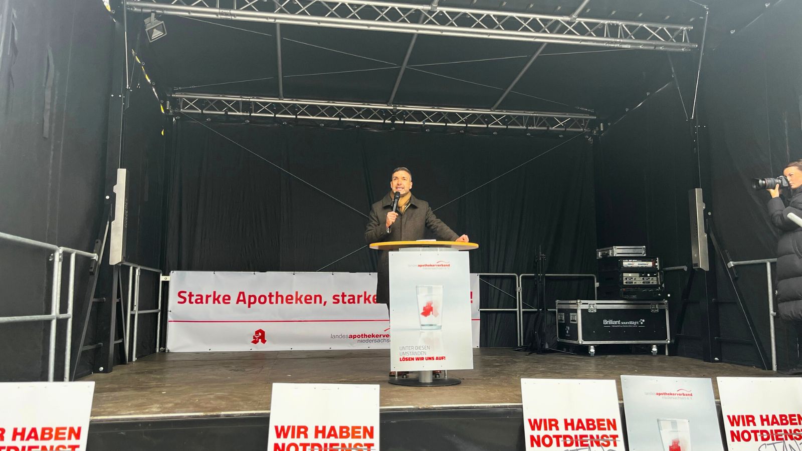 Die Kundgebung wurde von Groeneveld um 13 Uhr eröffnet. Als Redner sind Niedersachsens Gesundheitsminister Dr. Andreas Philippi, der FDP-Landesvorsitzende und stellvertretende Fraktionsvorsitzende im Bundestag, Konstantin Kuhle, der CDU-Landtagsabgeordnete Eike Holsten und Christian Burgdorf, Vorsitzender des Arbeitgeberverbands Niedersächsischer Apotheken, anwesend. Weitere Landtagsabgeordnete aus Niedersachsen nehmen nach Angaben des LAV ebenfalls teil.
