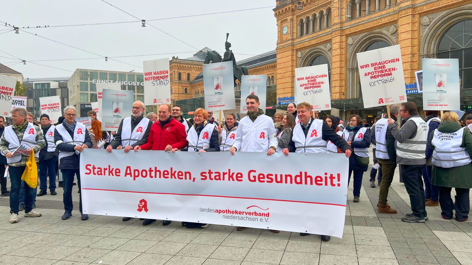 Heute kamen Apothekenteams aus ganz Niedersachsen und auch aus anderen Bundesländern auf dem Bahnhofsvorplatz in Hannover zur Kundgebung zusammen. Aufgerufen hatte der Landesapothekerverband Niedersachsen (LAV). Um 13 Uhr startete die Kundgebung in Hannover. APOTHEKE ADHOC war live vor Ort. Der LAV-Vorstandsvorsitzender Berend Groeneveld forderte unter anderem ein „Apothekenfinanzstabilisierungsgesetz“ (Apotheken-FinStG).