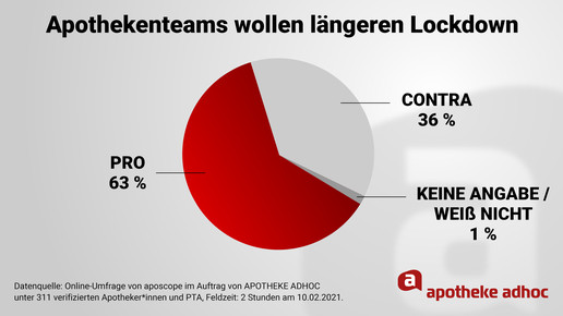 Die Aussicht, dass der Lockdown heute bis 14. März verlängert wird, schockiert viele Menschen. Laut einer Mehrheit der Deutschen sollten Schulen, Kitas und Einzelhandel bald wieder geöffnet werden. Bei den Apothekenteams zeigt sich ein anderes Bild. Ein Großteil hält eine Verlängerung des Lockdowns für notwendig – auch wegen der grassierenden Virus-Mutationen.