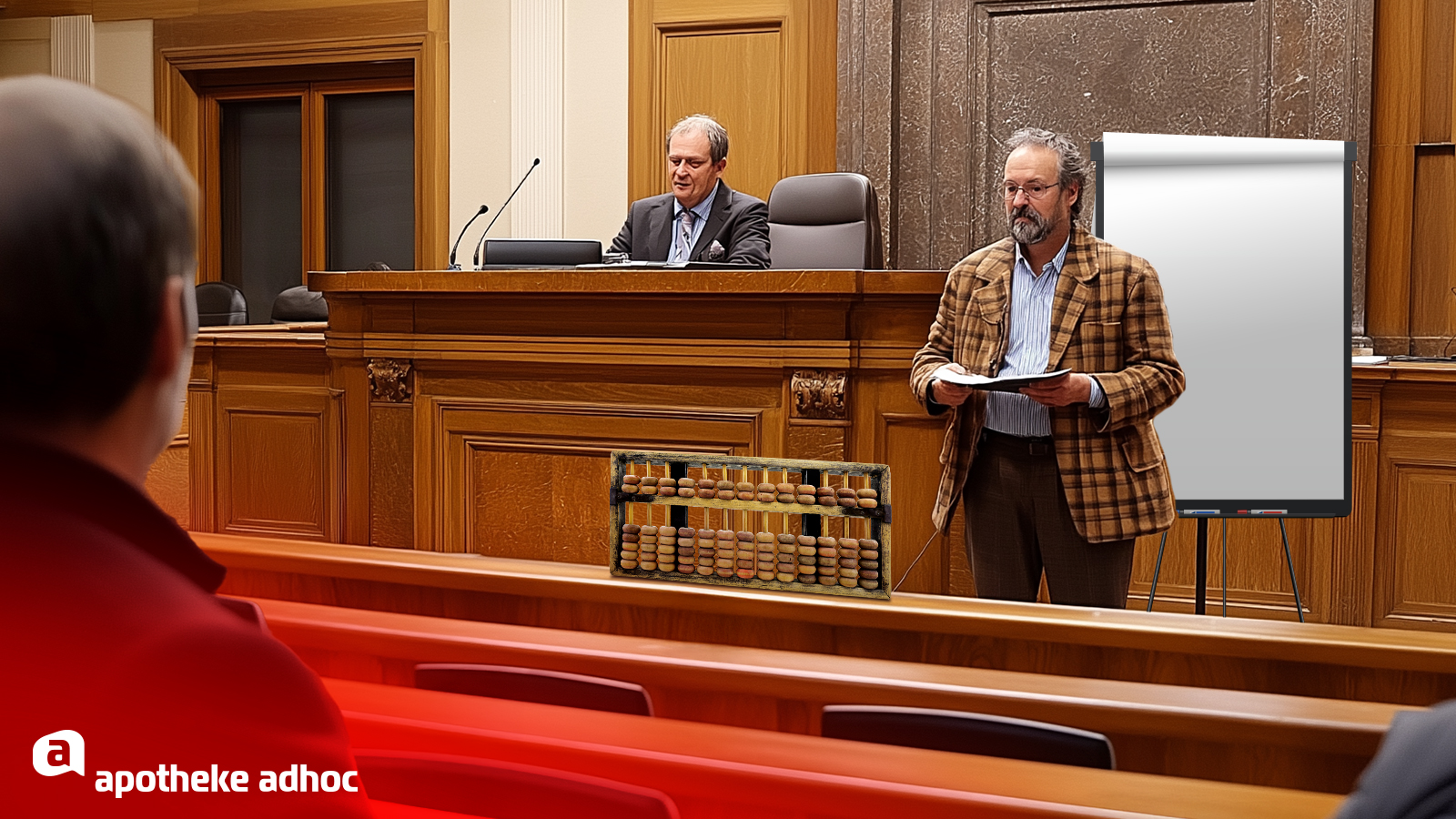 Schiefe Brille, zerzaustes Haar, verblichenes Tweed-Jacket: Professor Dr. Giesbert Neumann, Experte für angewandte Algebra, sitzt mit seiner abgewetzten Aktentasche auf dem Schoß vor dem Gerichtssaal und wippt nervös mit den Füßen. Zahlen liebt er wie andere ihre Modelleisenbahn – detailversessen, ohne Ironie. Er ist kein Digital-Professor, sondern ein Analog-Sachverständiger auf Mission. Vor dem Bundesgerichtshof will er retten, was für ihn das Rückgrat der Arzneimittelversorgung ist – die Preisbindung für verschreibungspflichtige Medikamente. Ein letztes Gefecht gegen Rabattlogik, Versender und europarechtliche Schlupflöcher. Dann der Ruf: „Herr Professor Neumann, bitte!“