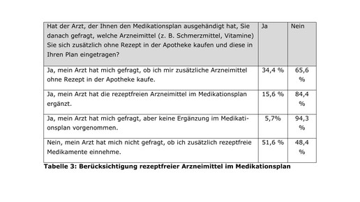 Für den Nutzen der Arzneimittelliste ist auch der Eintrag apothekenpflichtiger Medikamente sinnvoll. Die Patienten konnten daher in der Untersuchung ausführlich mithilfe von Mehrfachantworten wählen, wie der verantwortliche Arzt mit dem Thema Selbstmedikation umgegangen ist. Mehr als die Hälfte der Befragten mit Medikationsplan wurden nicht gefragt, ob sie sich zusätzlich rezeptfreie Arzneimittel in der Apotheke gekauft hätten.
