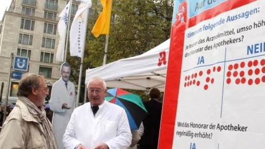 Unter dem Motto „Hätten Sie es gewusst? Apotheken-Honorar auf den Punkt gebracht!“ werben die Apotheker um Aufmerksamkeit für ihren Berufsstand. An einer Aktionswand können Passanten ihre Antworten hinterlassen und werden dabei von den Teilnehmern aufgeklärt.
