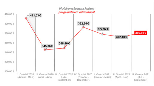Die Notdienstpauschale ist im dritten Quartal auf den bislang höchsten Wert in diesem Jahr gestiegen. Wie der Nacht- und Notdienstfonds (NNF) mitteilt, gibt es je geleistetem Volldienst 380,86 Euro. Im ersten Quartal waren es 377,92 Euro, im zweiten Quartal waren es 372,40 Euro. Dabei wurden zwischen Juli und September mehr Notdienste geleistet als in den beiden Quartalen zuvor.