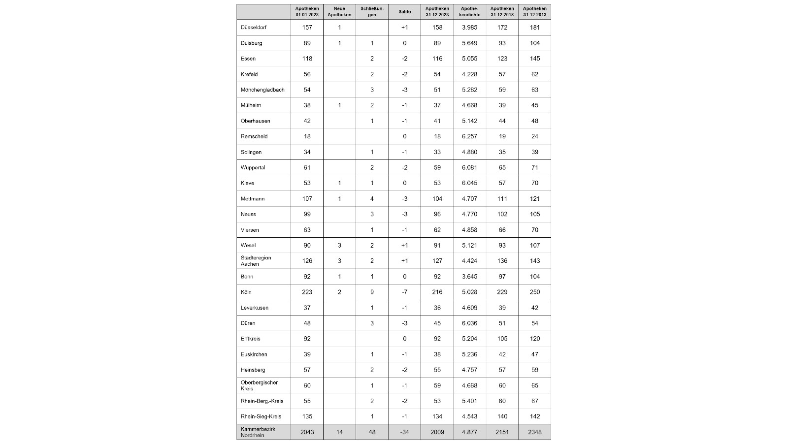 2023 haben 48 Apotheken im Kammerbezirk geschlossen – die meisten in Köln. Hier stehen neun Schließungen zwei Neueröffnungen gegenüber. Mettmann verzeichnet vier Schließungen und nur eine Neueröffnung. In Neuss, Düren und Mönchengladbach haben je drei Apotheken geschlossen und keine neu eröffnet.