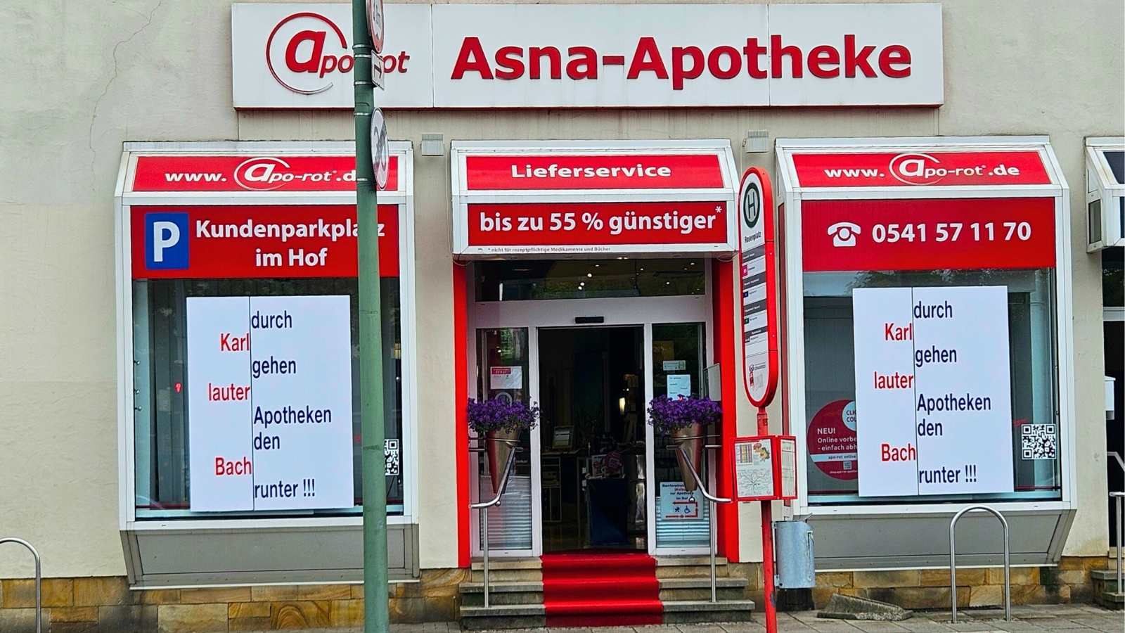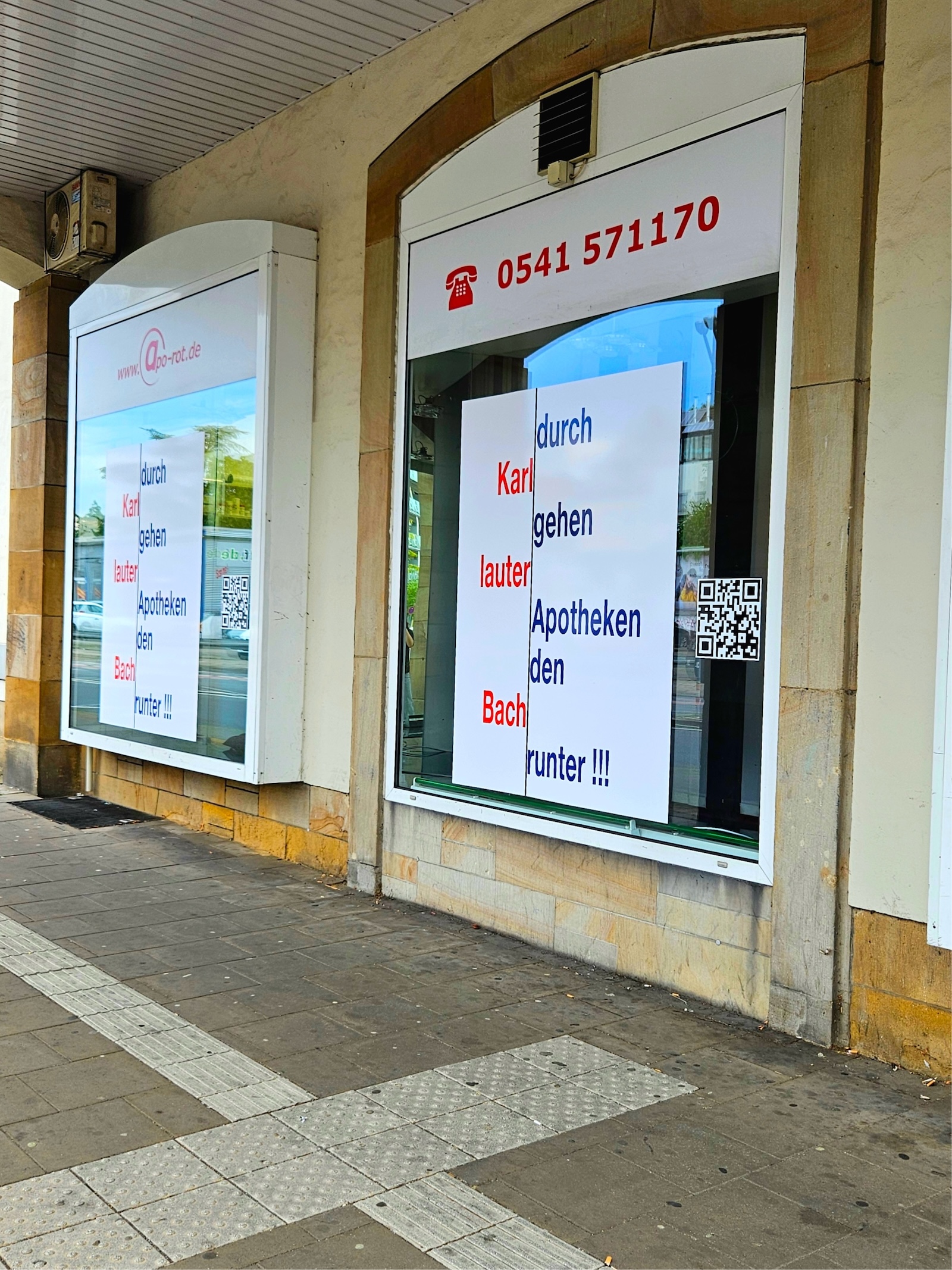Apothekeninhaber Karl-Bernd Frerker aus der Asna-Apotheke in Osnabrück will auf die aktuelle Lage der Apotheken aufmerksam machen. Nach einem Spontaneinfall brachte am frühen Mittwochmorgen ein Dekorateur die riesigen Fensteraufkleber aus Frerkers Feder an. „Die Menschen kommen in die Apotheke und sprechen uns auf die Plakate an“, berichtet er.