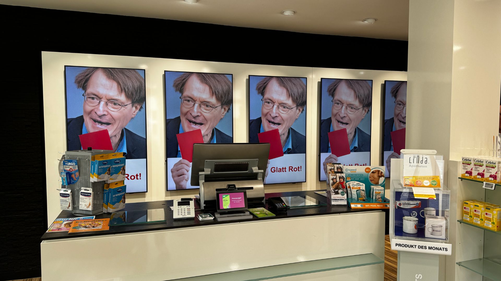 Um seinen Frust über die Politik trotzdem deutlich zu machen, zeigen die 20 Bildschirme in seinem Filialverbund seit Samstag dem Gesundheitsminister die rote Karte. „Bis jetzt hat die Aktion unter den Kollegen und Kolleginnen eine sehr breite Resonanz erfahren. Ich habe die Datei schon mehrfach zur Verfügung gestellt“, so der Inhaber. Wenn es nach ihm ginge, hätte Lauterbach die rote Karte absolut verdient.