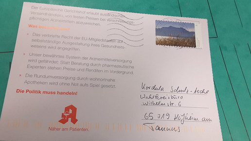 Auf Twitter postet Schulz-Asche eine an ihr Wahlkreisbüro adressierte ABDA-Postkarte mit dem Slogan „Die Politik muss Handeln!“ Dazu macht sie ihrem Unmut über die ABDA-Kampagne Luft: „Offensichtlich ist das Ziel der Lobby nur Verunsicherung, sonst gäbe es eine Adresse zum Antworten.“ Mehrfach hatte sich die Gesundheitspolitikerin der Grünen seit dem EuGH-Urteil gegen ein Verbot des Versandhandels ausgesprochen.