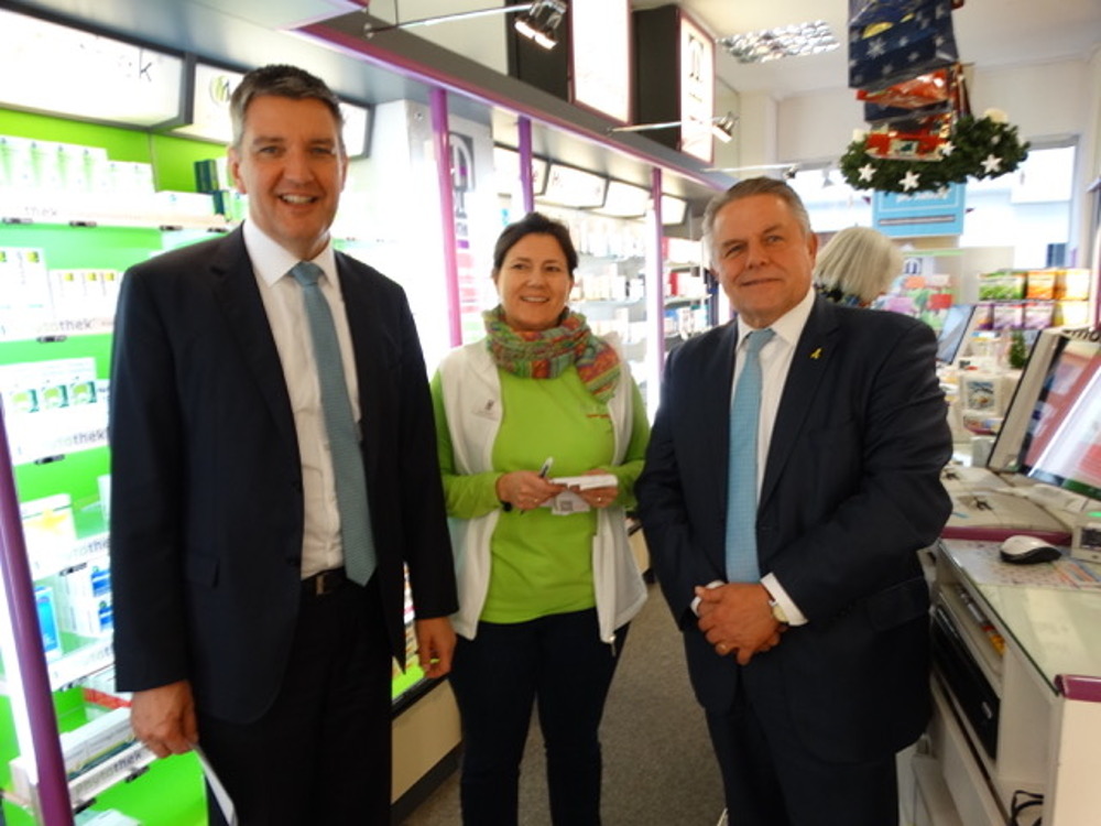 Dafür sagten Optendrenk und Schummer den Apotheken ihre Unterstützung zu, denn die ortsnahe Patientenversorgung müsse auch weiterhin gesichert sein. Eine zeitnahe und gute Versorgung der Krebspatienten dürfe nicht durch eine überzogene Rationalisierung gefährdet werden. „Es muss eine Diskussion über die Qualitätsstandards und die Kostendeckung geben, damit die ortsnahen Apotheken auch weiterhin die Qualität anbieten können, die die Bürger im Falle einer Erkrankung von ihnen erwarten“, so Optendrenk. An dem Gespräch nahm neben Roland Christmann auch Christian Köhler, der Inhaber der Neuen Grenzapotheke in Kaldenkirchen teil, der die Probleme der Apotheker bestätigte.