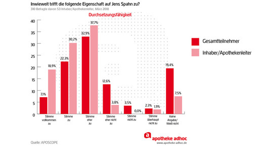 Dass er seine Vorstellungen und Interessen verwirklichen kann, davon gehen die Apotheker aus: 87 Prozent der Apothekenleiter sprechen ihm „Durchsetzungsfähigkeit“ zu. Unter allen Befragten sind es 62 Prozent, Wiederum 19 Prozent haben keine Angabe zu dieser Frage gemacht, unter den PTA sogar 38 Prozent.