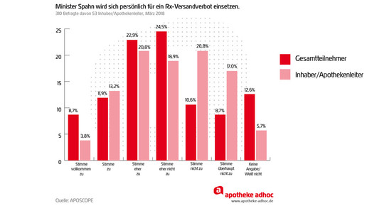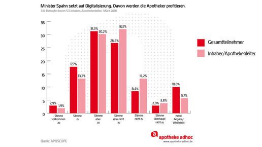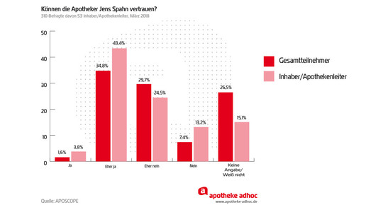 Bei APOSCOPE wurde abschließend auch die Vertrauensfrage gestellt: Können die Apotheker Jens Spahn vertrauen? Die Inhaber meinen überwiegend ja – 47 zu 38 Prozent, der Rest ist unentschlossen. Auch bei den Angestellten Apothekern überwiegt das Vertrauen, wenn auch knapp (44:41 Prozent). Skeptischer sind die Filialleiter (41:51 Prozent) und die befragten PTA (29:32), von denen aber 40 Prozent sich erst noch ein Bild machen wollen.