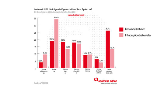 Langweilig werden dürfte es mit Spahn nach den Erwartungen der Branche jedenfalls nicht, vielleicht wird es sogar unterhaltsam – die ersten Tage rund um seine Ernennung zum Minister sind insoweit vielversprechend. Und 41 Prozent der Teilnehmer (57 Prozent der Inhaber) halten den Münsteraner für unterhaltsam, jeder dritte Befragte nicht.