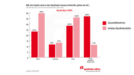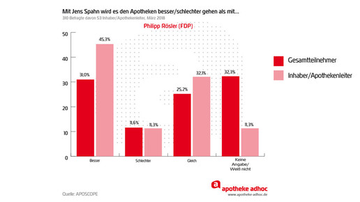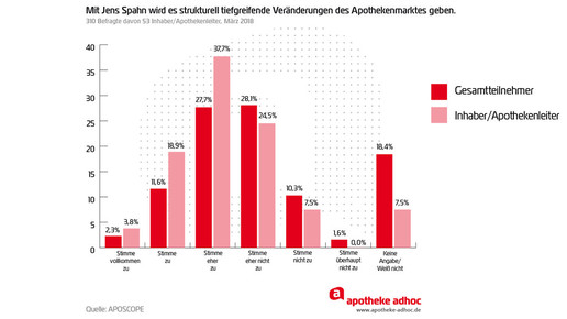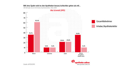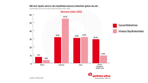 Die Apothekenleiter sind sich jedenfalls sicher, dass Spahn etwas verändern will: 94 Prozent stimmen der Aussage teilweise oder voll zu, dass Gröhes Nachfolger „Gestaltungswillen“ besitzt. Unter allen Befragten sind es 66 Prozent, die Mehrzahl der kritischen Stimmen kommt aus dem Lager der PTA: Von ihnen erkennen 21 Prozent keinen besonders großen Gestaltungswillen.
