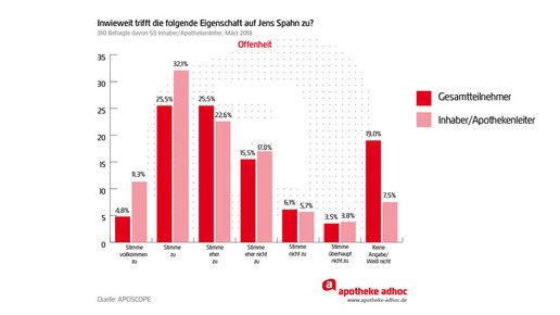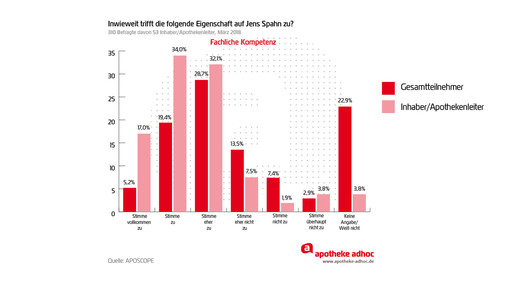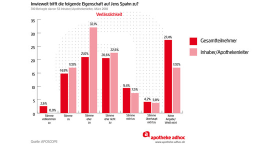 Dasselbe gilt für die Verlässlichkeit: 38 Prozent äußerten bei dieser Frage Zustimmung, aber fast ebenso viele (34 Prozent) Ablehnung. In der kritisch gestimmten Gruppe der Befragten überwiegen die Apothekenleiter, von denen fast jeder zweite (49 Prozent) Spahn für nicht verlässlich hält.