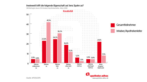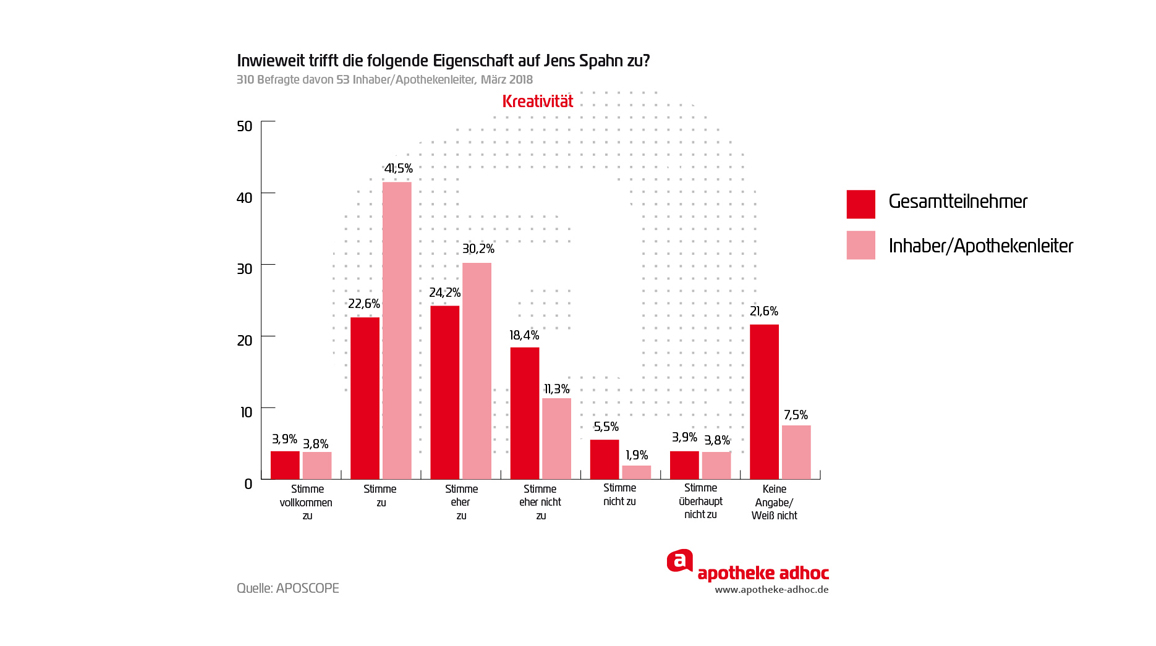 Und wie wird Spahn sein neues Amt führen? Wird er offen sein für Vorschläge der Apotheker, wird er selbst Ideen einbringen und das Gesundheitssystem gestalten? Auch zu diesen Fragen überwiegt die Zustimmung: 56 Prozent sehen „Offenheit“ als positive Eigenschaft des Minister, sogar zwei Drittel der Inhaber. „Kreativität“ bescheinigen ihm 51 Prozent aller Befragten und drei von vier Inhabern. Ablehnung in diesen Bereichen wird meist zurückhaltend – „trifft eher nicht zu“ – ausgedrückt.