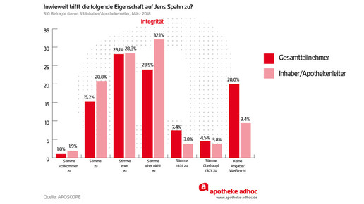 Spahn hatte in der Vergangenheit seine kleineren Verfehlungen, was die Vermischung von Politik und Lobbyinteressen angeht. Die Teams in den Apotheken halten ihn zwar trotzdem überwiegend für integer, die Bewertung fällt hier aber weniger positiv aus als bei anderen Eigenschaften: 44 Prozent attestieren ihm Integrität, 36 Prozent nicht. Weitere 20 Prozent sind in dieser Frage unsicher – hier wird Spahn also noch überzeugen müssen.