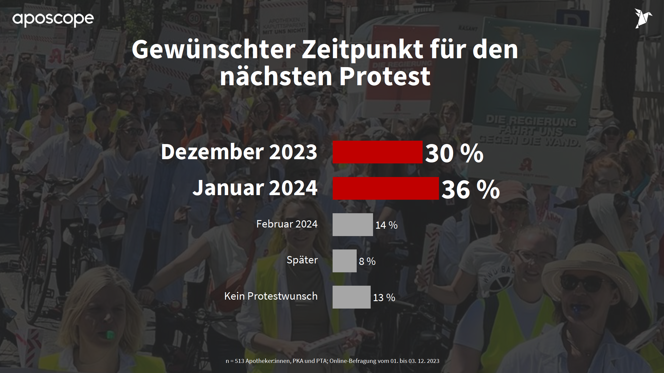 Das dauert dem Großteil der Kolleg:innen zu lange – zumal ohnehin nur etwas mehr als die Hälfte mit der Protestaktion zufrieden ist. 87 Prozent wünschen sich weitere Proteste. Drei von zehn Apotheker:innen, PKA und PTA sind bereit, noch im Dezember erneut die Themen der Apotheken auf die Straße zu bringen. Mehr als ein Drittel wünscht sich weitere Proteste im Januar.