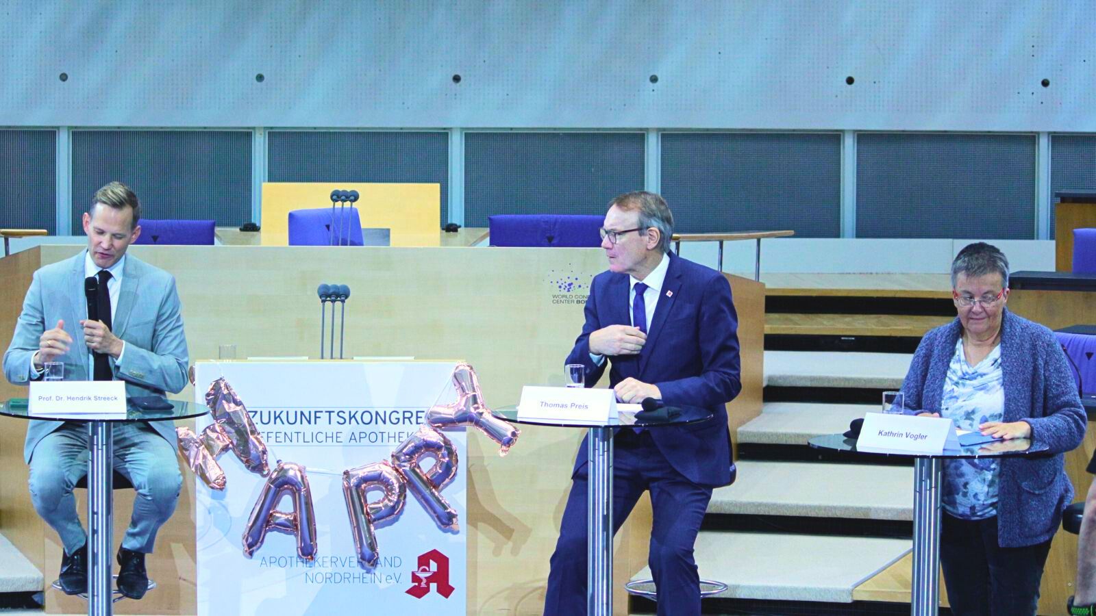 Hitzige Diskussion: Auf dem diesjährigen Zukunftskongress Öffentliche Apotheke debattierten Professor Dr. Hendrik Streeck (CDU), Kathrin Vogler (Die Linke) und Thomas Preis, Abda-Präsident und Vorsitzender des Apothekerverbandes Nordrhein (AVNR). Vor allem Vogler und Streeck wurden sich dabei nicht einig.