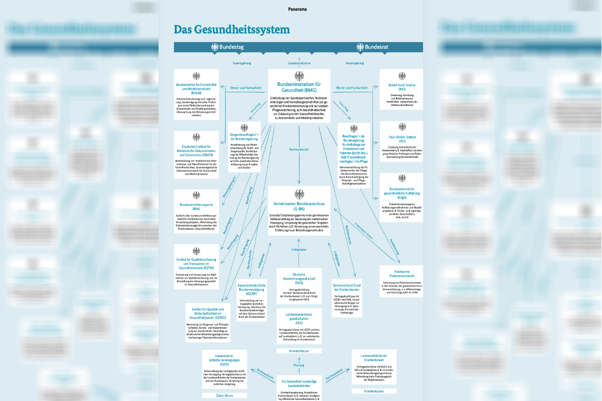 Damit leistet das BMG „Wiedergutmachung“ für die Panne in der ersten kostenfreien Lieferung von „Im Dialog“. Denn auf dem großen Poster in der Heftmitte „Das Gesundheitssystem“, das die Vernetzung aller Akteure im Gesundheitssystem veranschaulicht, fehlten ausgerechnet die Apotheken.