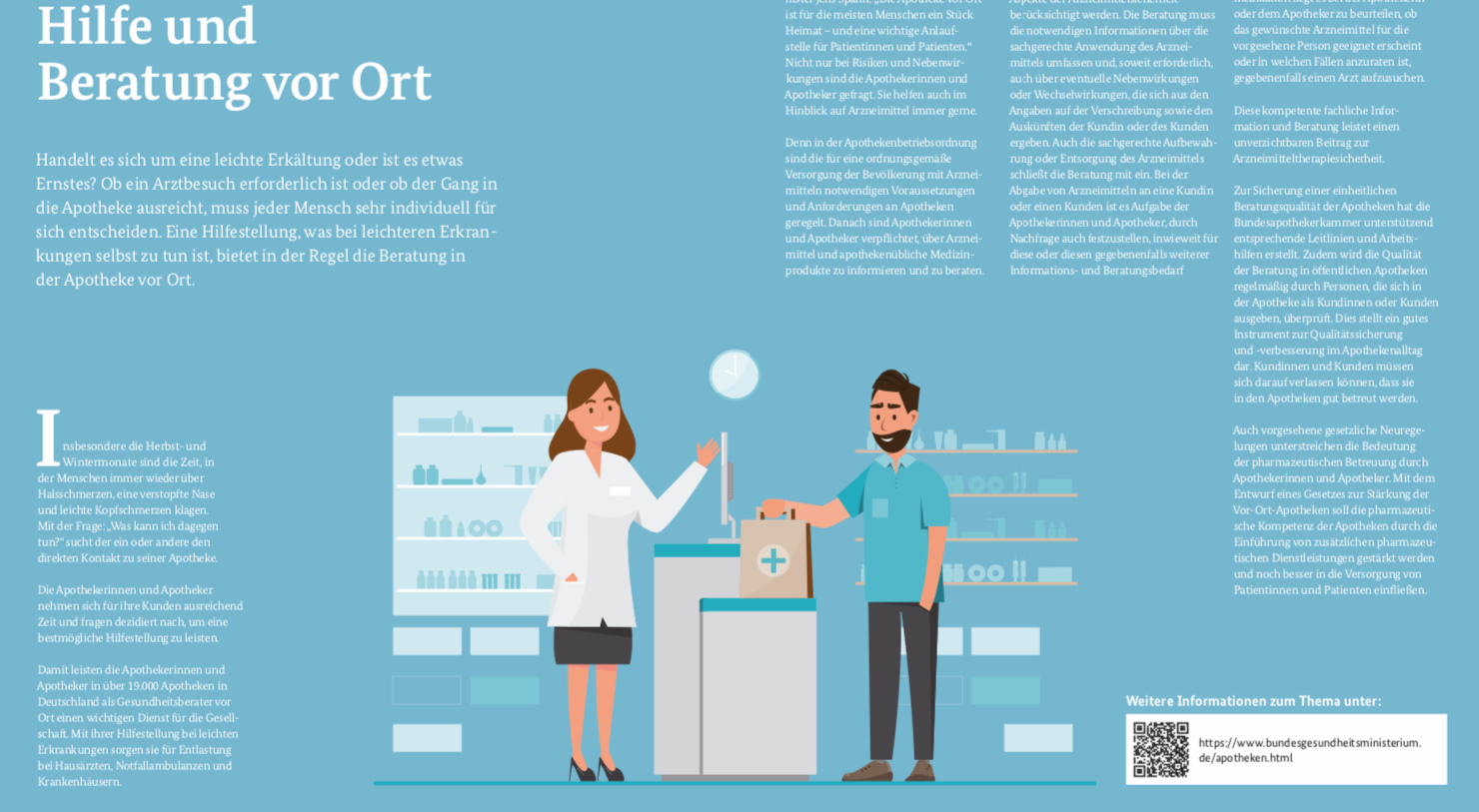 „Handelt es sich um eine leichte Erkältung oder ist es etwas Ernstes?“, leitet der Text mit der Überschrift „Hilfe und Beratung vor Ort“ seine Eloge auf die Apotheken ein. Ob ein Arztbesuch erforderlich sei oder ob der Gang in die Apotheke ausreiche, müsse jeder Mensch für sich entscheiden. Dann folgt der Hinweis auf die Kompetenz der Pharmazeuten: „Eine Hilfestellung, was bei leichteren Erkrankungen selbst zu tun ist, bietet in der Regel die Beratung in der Apotheke vor Ort.“ Insbesondere die Erkältungssaison hat das BMG dabei im Blick: Die Herbst und Wintermonate seien die Zeit, in der Menschen immer wieder über Halsschmerzen, eine verstopfte Nase und leichte Kopfschmerzen klagten.